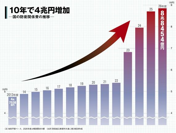 中国が海洋進出を強め、北朝鮮がミサイル発射を続ける中、22年にはロシアがウクライナに侵攻。危機感を強め国防費の拡大方針を決めるEU各国に続くかのように、日本政府も22年末、防衛費の急拡大を決定したのだ。長く続いた「GDP比1%程度」から「2%」へ「27年度」に引き上げるとした。23年度の防衛予算(当初予算ベース)は前年度比1.3倍の6.8兆円に拡大し、26年度には8.8兆円に上る見通しになっている。