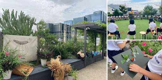 エレベーターで屋上へ上がり、扉を抜けた先に広がる菜園の様子に、子どもたちは目を輝かせる。みんなで輪になり授業の目標を共有した後、7~8人のグループに分かれてガーデン観察がスタート。各グループにはESYJのグループティーチャーが配され、子どもたちを見守る。