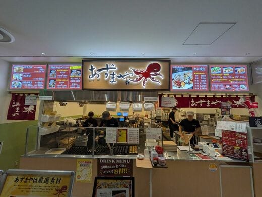 今回は、たこ焼きの「あずまや」でも注文してみる。フードコートのたこ焼き店はそう珍しくないが、このブランドは初めて見かけた。あと、なんだか素材にこだわっていそうなのと、選べる味付けの種類が膨大なのも面白い。