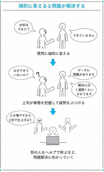 この、相手の「なぜ? どうして?」に答えていくことによって、自然とコミュニケーションが図られて、問題の所在がわかるのです。「できていません」の結果だけ聞いていきなり激怒する人は少ないと思います。さすがに、その先の話も聞かなくては判断できません。だから、むしろ、イエス・ノーで端的に答えたほうが、怒られにくいのです。