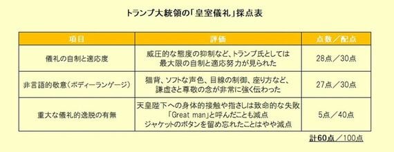 今回のトランプ大統領の皇室儀礼について、白羽氏が採点した表が以下の図だ。