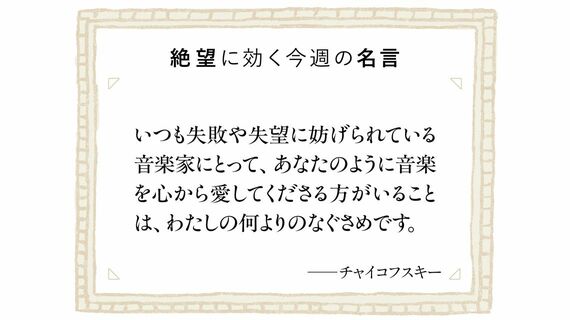 自分のした仕事を「最低だ。何の値打ちもなく、稚拙で、もうやめたほうがいい」とけなされたとしたら? 誰に言われたのかにもよるだろう。たとえ上司でも、尊敬できない、実績もない人に言われたのなら、「おまえなんかに言われたって」と無視できるかもしれない。しかし、尊敬していて、これまで世話にもなっていて、実力も実績もある上司から言われたとしたら、心が砕けてしまわないだろうか。若き日のチャイコフスキーに起きたのは、まさにそういうことだった。