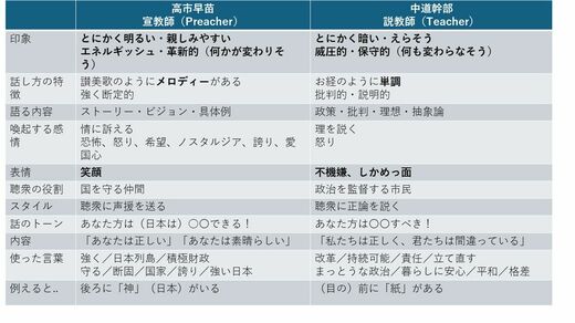 高市氏と中道側のスポークスパーソンたちのコミュニケーションの対照的な特徴を表にまとめてみましたが、一言で言い表すと、「宣教師」と「説教師」という言葉で説明できるかもしれません。