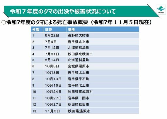 環境省によると、今年度に入ってからクマに襲われて死亡した人の数は13人に上り、過去最多だった2023年度の6人の2倍を超えている(11月5日現在。※外部配信先では表を閲覧できない場合があります。その際は東洋経済オンライン内でお読みください)。
