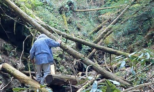 田んぼや生活に必要な自家用水を山から引いており、40年前につくった取水ダムの様子を定期的に確認しているという。松田さんはスコップを片手に、標識もない山道へと入っていった。