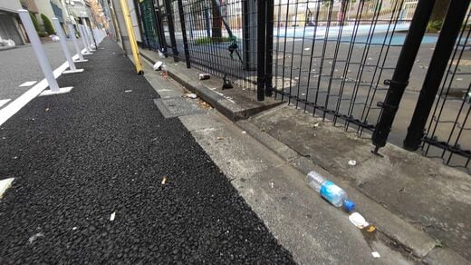 同センターは大久保公園に面した場所にある。公園は夜から朝にかけて閉鎖されるが、その周辺に階段や段差があるため座りやすく路上飲みの絶好のスポットとなる。路上飲みをした人がごみを持ち帰るわけもなく、缶やタバコの吸い殻が散乱している。