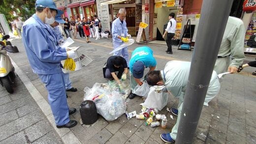 一方で、このような行政側の対応が必要となるのも、ごみ排出のルールを守らず四六時中排出する事業者(店舗など)の排出行為が続くからである。最近は外国人がオーナーとなる店舗が増えており、破袋調査によってそれらの店舗がルールを守らずに排出するごみが多くなっている。また、飲酒で気が大きくなり自らの理性を失うのだろうか、通行人のごみ山へのポイ捨て行為も後を絶たない。