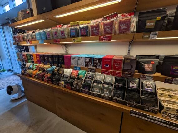 同店ではカフェタイムだけでなく買い物も楽しめる。店内の棚には自宅用のコーヒーも充実していた。特に、サザコーヒーオリジナルのドリップパック「カップオン」シリーズがずらり。出張のお土産に喜ばれそうだ。