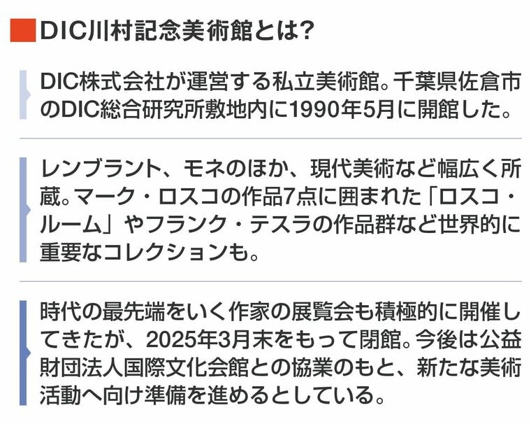 DIC川村記念美術館は、創業家の川村家・DICと関連会社が収集した美術品を公開するため、1990年5月に開館した私立美術館。日本美術からレンブラントやモネの名品、現代美術など、幅広い所蔵品が特徴だった。とくに米国抽象表現主義等の現代美術コレクションは他館では見られない強みで、現代美術関係者の間では重要視されている。