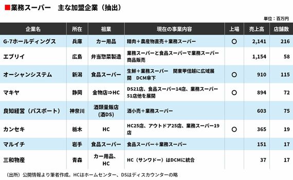 これらの祖業の業態、すなわちカー用品、ホームセンター、酒ディスカウンターなどのチェーンは、1970年代以降のモータリゼーションの進展とともに地方各地のロードサイドで勃興したが、2000年代以降の市場飽和と寡占化の進行によって再編淘汰の波に飲み込まれた。カー用品、ホームセンターなどの業態が、すでに有力大手によって市場が分割されていることはご存じの通りだろう。つまり、業務スーパーの有力加盟店は、地方小売りチェーンの「敗者復活戦」勝ち上がり組なのである。彼らがどんな会社か見ていこう。