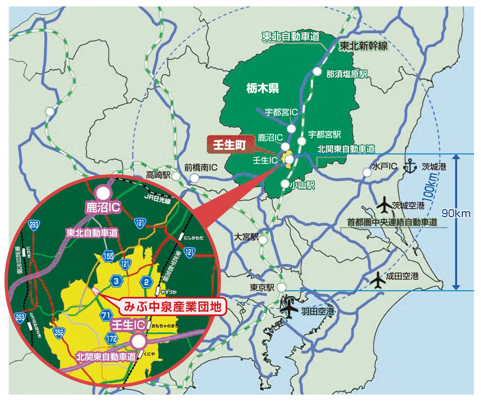 「みぶ中泉産業団地」は、北関東自動車道の壬生ICから約3.6キロ、車なら5分ほどで来られる近さだ。壬生ICと産業団地を結ぶバイパスは4車線あり、産業団地の物流需要に十分対応できる。東北自動車道の鹿沼ICからも約7.2キロ、車で約12分と、東北方面からのアクセスも良好だ。