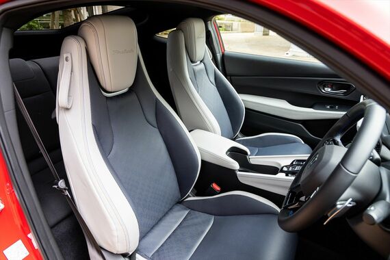 縦長のヘッドレストを組み込んだハイバックタイプの前席は、最近のクルマとしては着座位置が低めで、スポーティなクルマであることが走る前から実感できる。