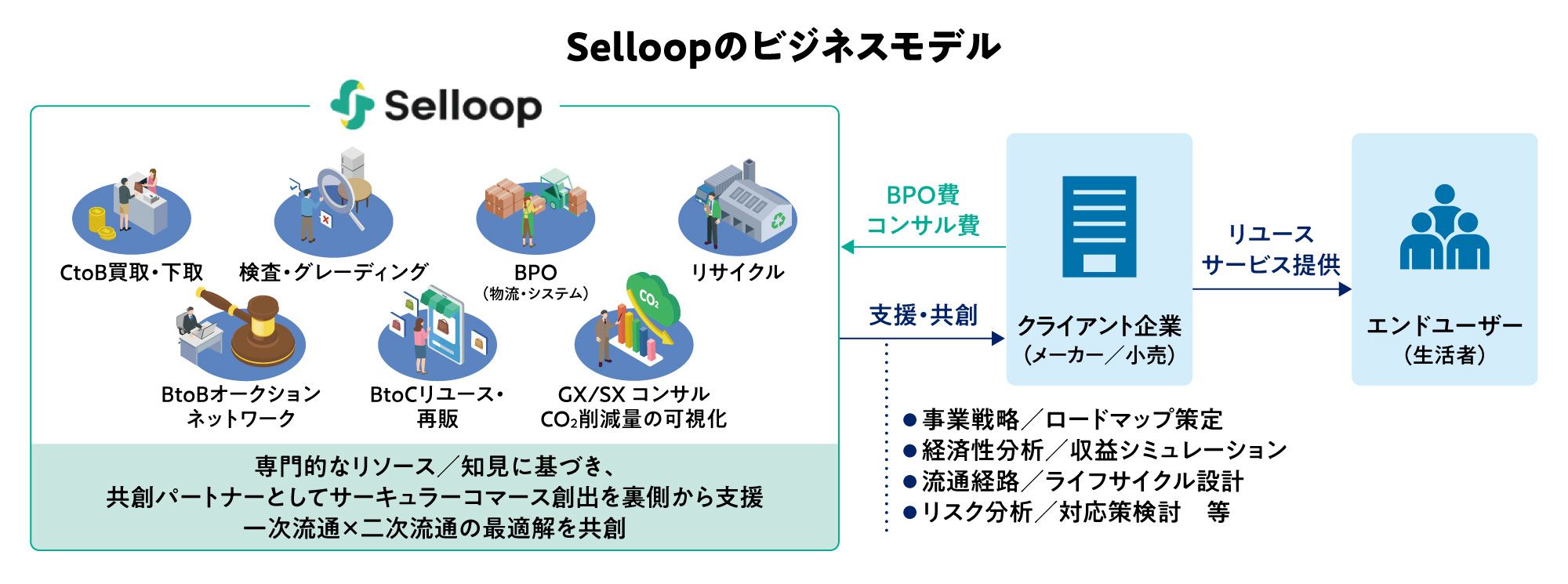 そして、「Selloop(セループ)」だ。メーカーと並走し、下取り・グレーディング・物流BPO・再販・リサイクルまで、二次流通に必要な機能を組み合わせて設計・運用する。