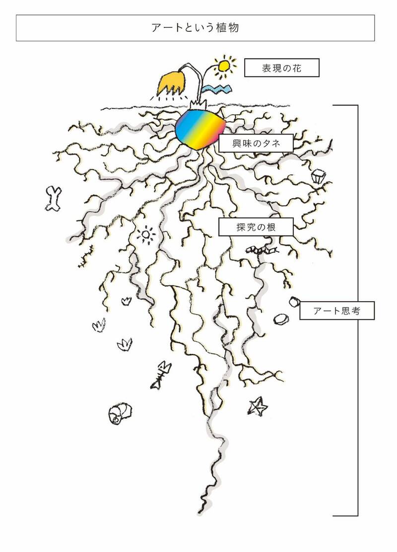 イラストを参照してほしい。植物にたとえると、地表部分に咲いている花はアートで言うところの「作品」、花の根元にあるタネはアート活動の源となる「興味のタネ」、タネから四方八方に伸びる無数の根はアート作品が生み出されるまでの長い探究を表す「探究の根」に当たる。
