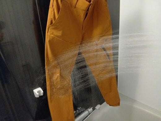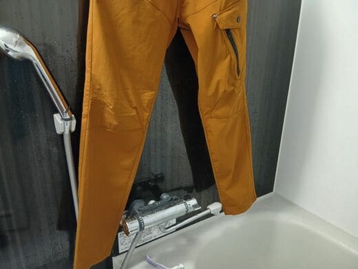 このパンツめがけて情け容赦なく、冷水のシャワーを噴射したところ、まるでレインコートのように水を弾き返した。これなら小雨程度であればまったく問題なさそうだ。