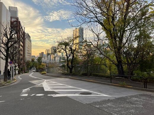 神保町からお茶の水に向かう途中にある、石段の坂の上からは、神保町の街を見下ろせるようになっていて、特に夕暮れ時の展望は風情が満載。筆者が訪れたときには、曲がり角に誰ともなく持ってきた「ガーベラ」の花が供えられており、たくさんの外国人観光客が思い思いに写真を撮っていました。