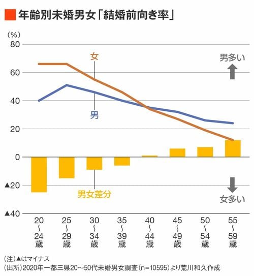 出生動向基本調査によれば、1990年代から30年以上、20〜30代独身男女の「結婚前向き率」は男4割、女5割でまったく変わらず推移していますが(参照→日本の若者「本当は結婚したい」のにできない真因)、男女間には常に10%の乖離があります。