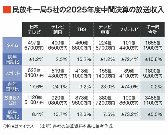 そして、放送収入全体では同5.5%のマイナスだった。コロナ禍以降の減少基調が継続している。つまり、「過去最高の売上高」はフジテレビの減少分が他局に回ってきたという一過性のもので、ちっとも喜べないのだ。