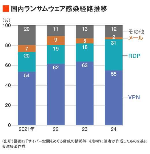 警察庁の「サイバー空間をめぐる脅威の情勢等」によれば、日本でランサムウェアの被害にあった企業の約8割がVPNやRDP(リモートデスクトッププロトコル)といった外部に露出しているIT機器やサービスを侵入経路としている。これらの標的を攻撃するために必要な情報はIDやパスワード、対象機器の脆弱性である。