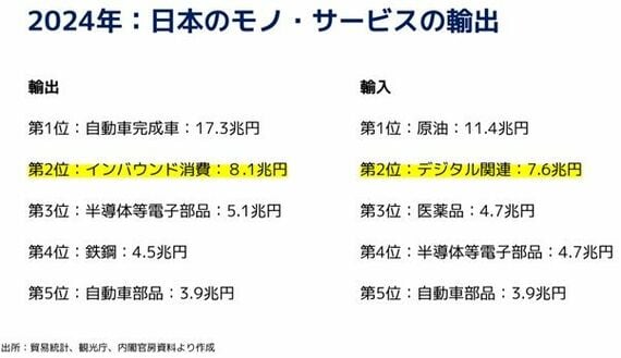 インバウンド消費の8.1兆円は、自動車完成車に次いで第2位の外貨を稼ぐ手段、つまり、円を強くし輸入品インフレを抑える手段として成長してきている。今後、インバウンドが政府目標の6000万人へ向かえば、インバウンドが日本最大の外貨獲得産業となる可能性もあるだろう。