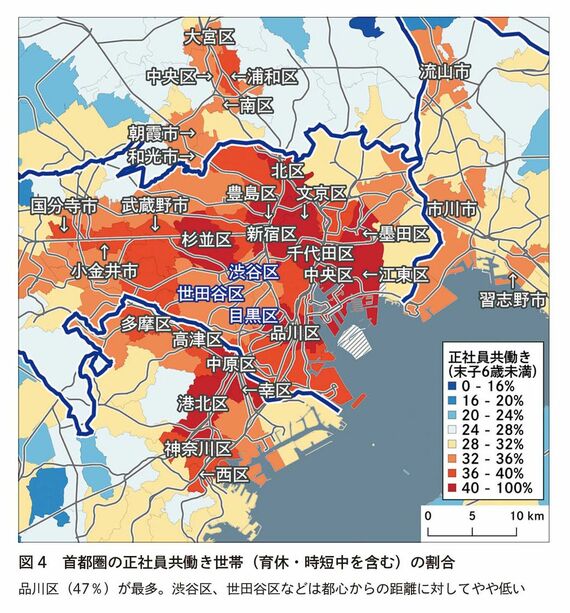首都圏では品川区(47%)を筆頭に、北区、中央区、文京区、杉並区、江東区、墨田区などで「正社員共働き」の割合が40%を超えています(近年の上昇トレンドを踏まえると、本書の刊行時点ではさらに高い割合になっていると推測されます)。また、JR南武線沿線の川崎市幸区、中原区、東急東横線などが走る横浜市港北区でも41~43%となっています。これらの地域では、