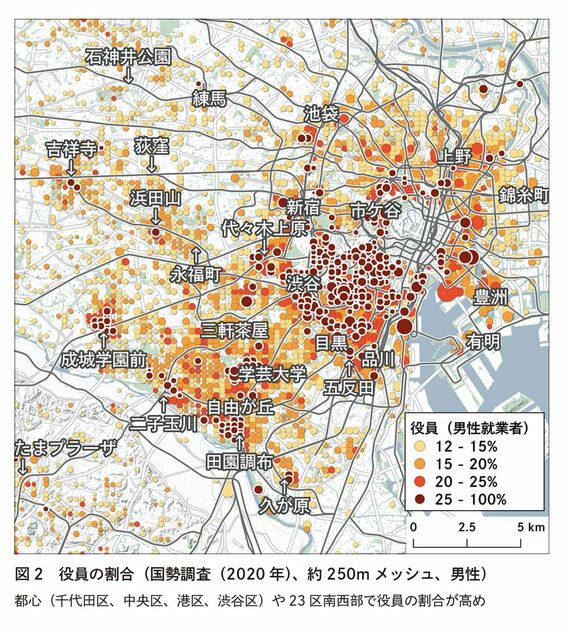 今度は、同じく総務省統計局「令和2年(2020年)国勢調査」を使って、約250mメッシュという詳細な役員の分布を見てみましょう(図2)。