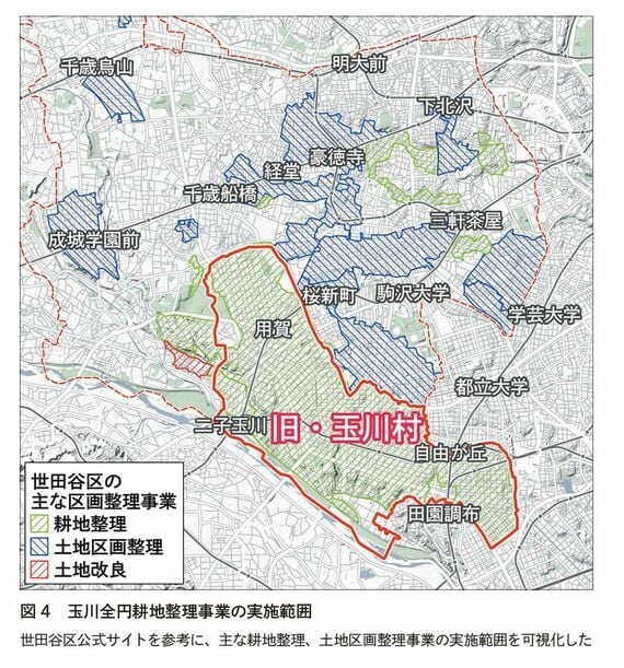 さらに、東急大井町線、田園都市線の沿線では、当時の玉川村長(豊田正治氏)の旗振りによって約1000ha(10㎢)という広い範囲で耕地整理※3が行われました(図4)。これにより、碁盤の目のように整った街区と生活インフラが整備され、戦後にかけて会社の役員や管理職などの転入が進んだのです。