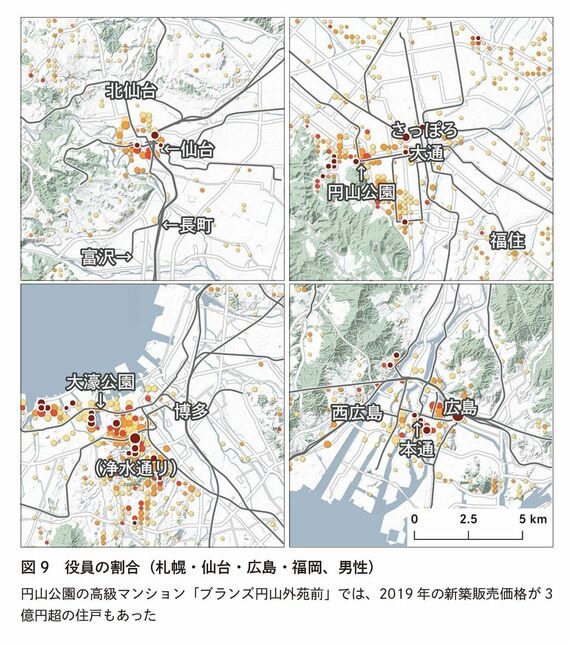 札幌では北海道神宮に近い円山地区、福岡では大濠公園の周辺やその南側の高台(浄水通り)が、それぞれを代表する高級住宅地です(図9)。どちらも都心に近接しながら、大きな公園や豊かな緑といった希少性の高い住環境を誇ります。