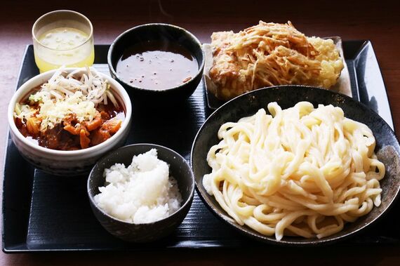 筆者の訪れた日は「ごぼうかき揚げ」「さつまいも」「柿」「かぼちゃ」「人参」「ネギ天」「ちくわ天」がラインナップされていた。かき揚げやさつまいもの天ぷらは一般的なうどん店で見かける大きさだが、単品の野菜天ぷらはひと口サイズ。自分の胃袋に合わせた天ぷらを選択できる。