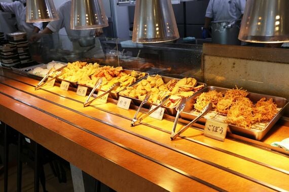 食べ放題の目玉はなんといっても天ぷらだ。注文を受け取るカウンターにバットが並べられており、そこから好きなものを取ることができる。