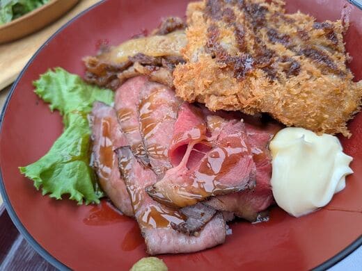 牛かつだけでもぜいたくなのに、ここに牛カルビとローストビーフが、ご飯の見えないくらい盛られているとはなんというスペシャルな丼だろうか。