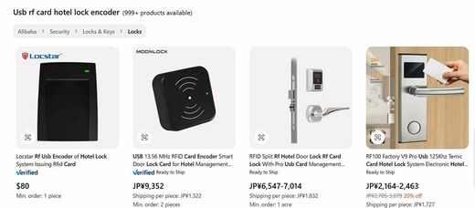 ここにPCなどを接続して開錠するという攻撃が報告されている。また、正規の通販サイトでもカードキーのリーダーやエンコーダーは、保守ツール、事業者向け製品として販売されている。少し怪しげな海外通販サイトに行けば、持ち運びできるスマートロックへのアクセスデバイスさえ手に入る。