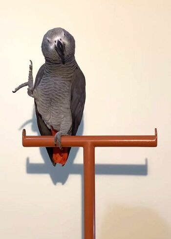 ショート動画のなかのヨウムが、おもむろに右足を高く掲げ、小首をかしげ、自分の頭を軽くつついて叫ぶ。