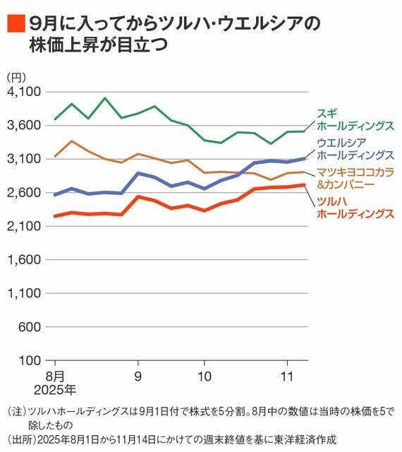 8月はM&Aや海外での提携先の拡大を相次いで発表したスギ、九州のドラッグストアチェーンの買収を発表したマツキヨココカラなどの株価の伸びが目立ったが、9月に入ると値動きは軟調となり、それに代わってウエルシアやツルハの株価が上向き始めた。