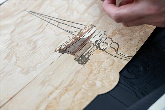 マストはまるで釣り糸のテグスのような細さの木片。それを埋め込んでいる。また一部には、1枚の木を薄くそいで開いて左右対称の木目を作り、空と空を映す水面の表現に使っている。