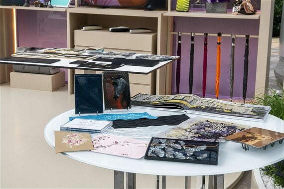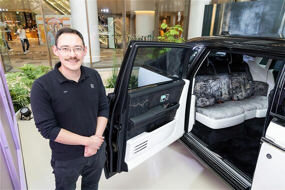 ファントム・センテナリーの発表会場では、特別にフェリス氏用のテーブルが用意され、薄い木材から金箔まで、同車の内装に使われた素材が並べられていた。