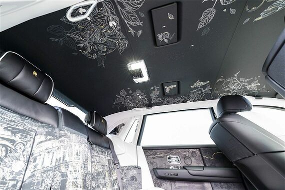 フェリス氏の専門ではないが、シートと天井の仕上げも注目に値する。レザー張りのフロントシートにはレザーで絵を描き、後席用シートはテキスタイルメーカーと開発した生地を使う。そこに、7世代にわたるファントムを主題にした複雑な絵がプリントされている。