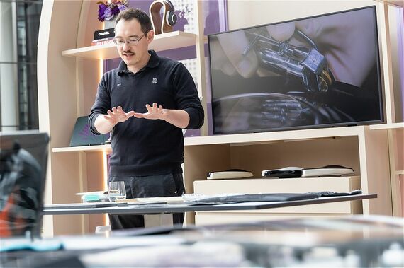 天井の刺繍の間からは、光ファイバーを使った星空が輝く。工場では専門職人が、1000本以上の光ファイバーを手作業で天井のパネルに埋め込んでいく。