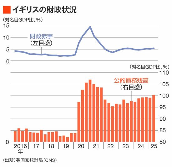 労働党政権の増税が物語るように、実際、イギリスの財政は改善が遅れている。直近2025年7〜9月期における財政赤字は名目GDP(国内総生産)比5.4%と、政権が発足した24年7〜9月期の4.9%からむしろ悪化している。財政赤字が膨らんだことで公的債務残高も膨張が続いており、25年4〜6月期時点で名目GDP比100%を超えてしまってた。