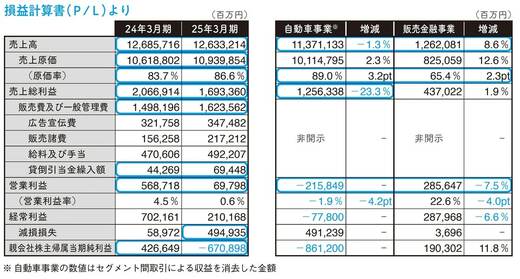 これに対して売上原価は前期から3211億円(3.0%)増加、原価率も2.9ポイント上昇しました。売上減と原価増の挟み撃ちにより、粗利は前期から3736億円(18.1%)減少。事業別に見ると、主因はやはり自動車で、金融は粗利が1.9%増加したのに対し自動車は原価率が3.2ポイント上昇した結果、粗利は23.3%も減少しました。