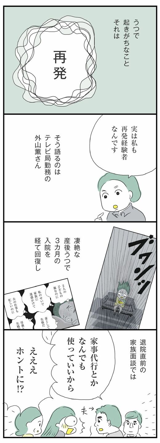 数回に分けて「産後うつ」の体験談を紹介しています。テレビ朝日勤務の外山薫さんは第二子出産後に凄絶な産後うつにかかり、入院もしました。今回は「再発と新しい治療法・rTMS(反復経頭蓋磁気刺激療法)とECT(電気けいれん療法)」についてです。