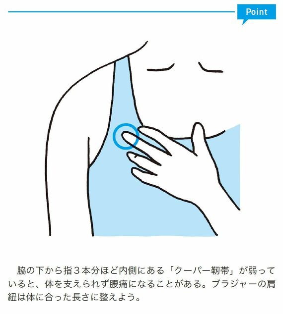 ブラジャーが原因で腰痛になっている人は、クーパー靭帯(脇の下から指3本分ほど内側にある胸のつけ根)と呼ばれる靭帯を押すと強い痛みを感じます。
