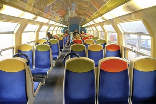 RER-A線は、パリ市内でもとくに混雑する繁華街を抜けていく路線だ。そのため、2階建て車両とはいえドアの数を増やして少しでも乗降時間のロスを減らそうという設計なのだろうが、2階へ通じる階段は両端2カ所の出入り口のみで中ドアにはなく、2階部分は通り