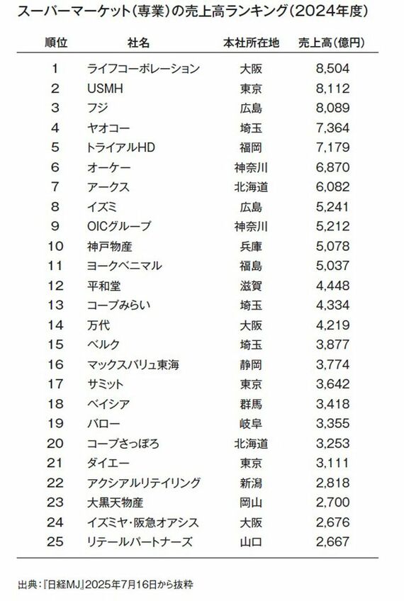 スーパーマーケット専業では、近畿圏と関東圏を地盤とするライフコーポレーションが首位に立つ。