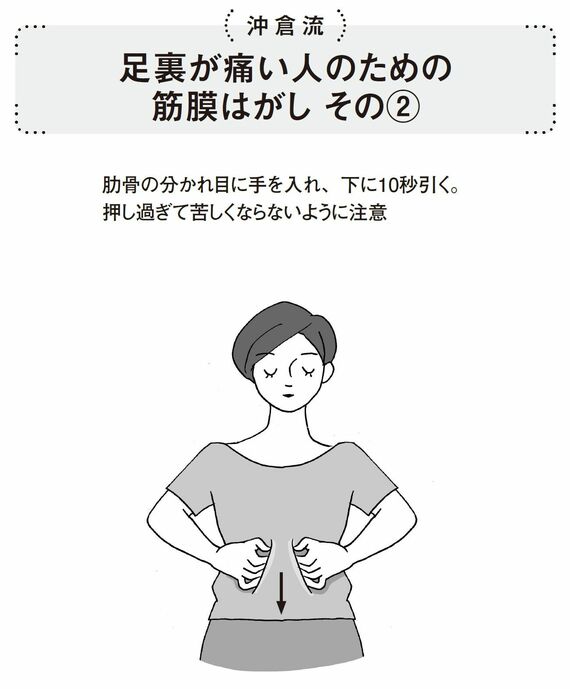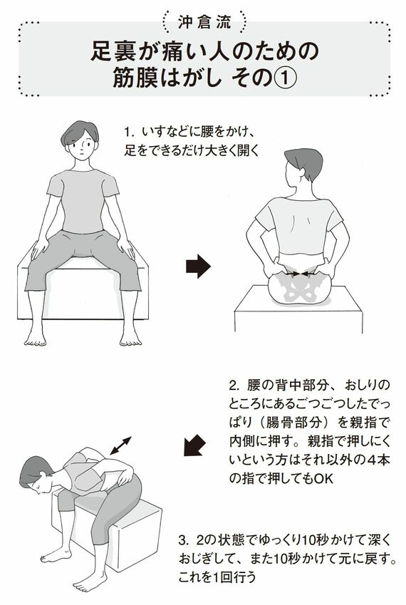 そのため、体の後ろ側の癒着をとるために紹介するのが「足裏が痛い人のための沖倉流筋膜はがし」です。症状に思い当たる方は、ぜひ試してみてください。