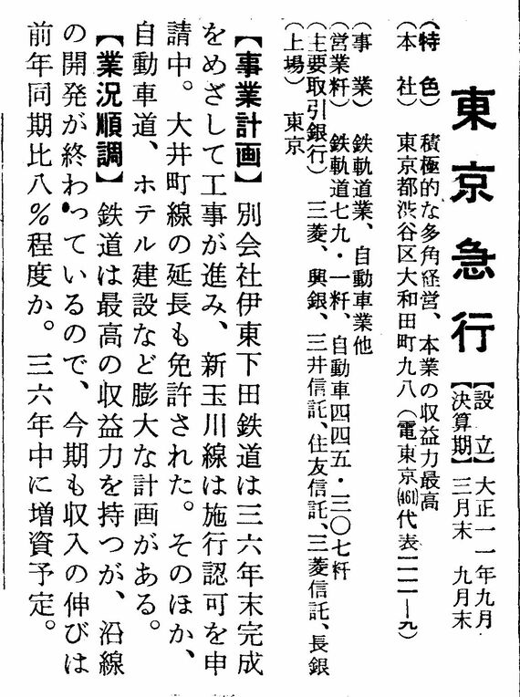 「別会社伊東下田鉄道は三六年末完成をめざして工事が進み、新玉川線は施行認可を申請中。大井町線の延長も免許された。そのほか、自動車道、ホテル建設など膨大な計画がある」