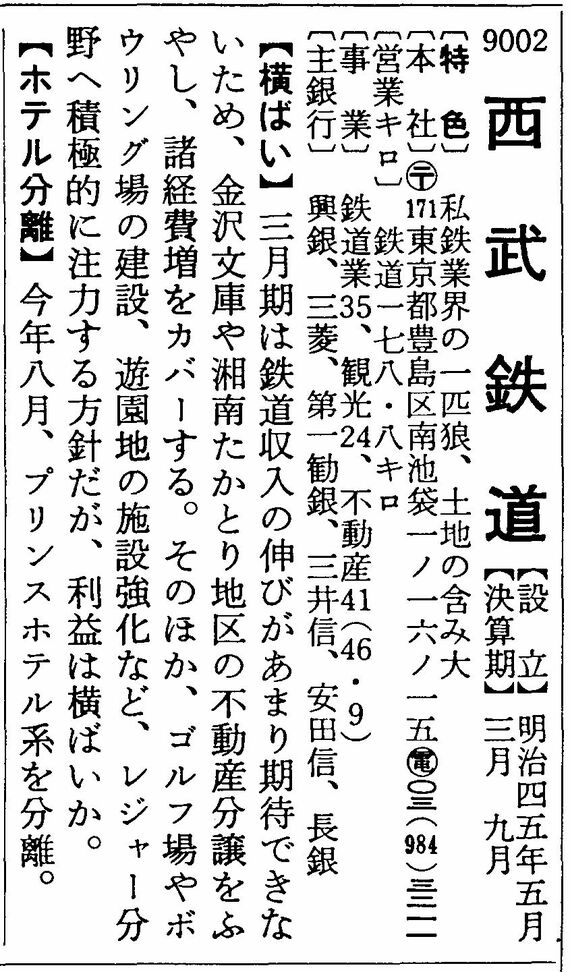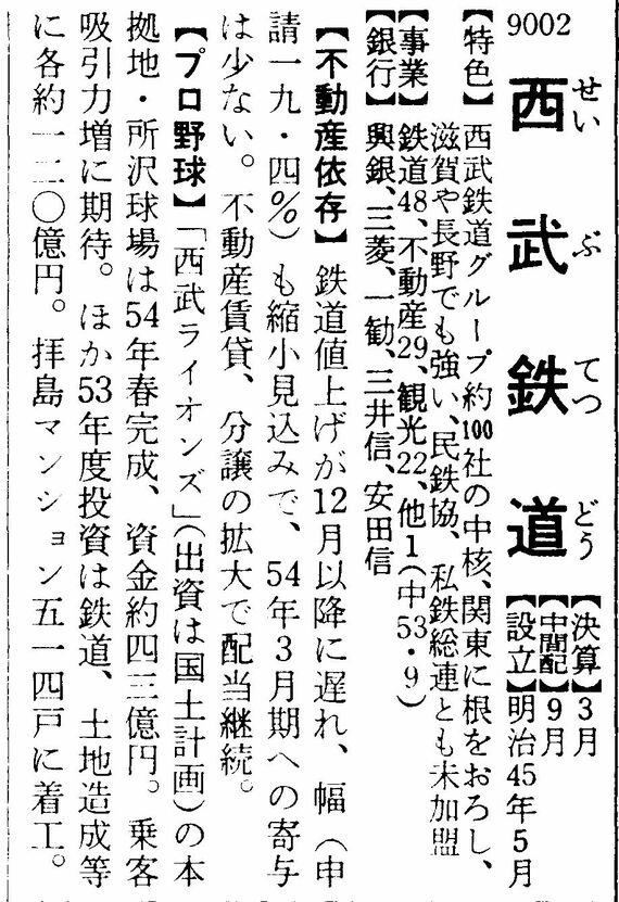 また、1979年新春号では「西武ライオンズ」(出資は国土計画)の本拠地・所沢球場は54年春完成、資金約四三億円、乗客吸引力増に期待」と書かれている。