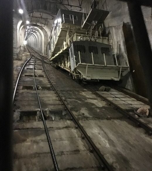 途中、映画『剱岳 点の記』(09年)の舞台地となった名峰・剱岳が望める展望台を通り、バスが着いた先は、「インクライン上部(じょうぶ)停留所」。ここからは、地底のトンネルを上下するケーブルカー「インクライン」に乗って発電所に向かいます。