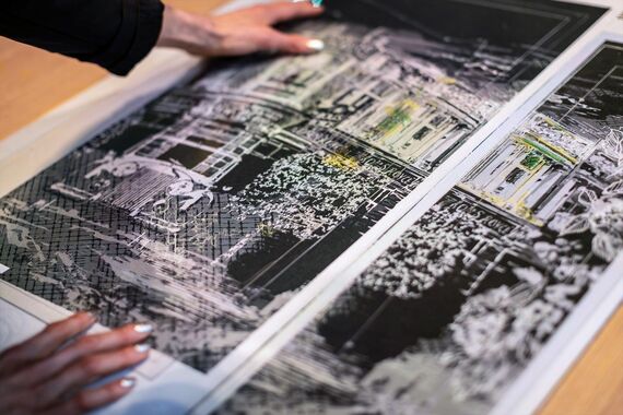 この歴史的な“行程”は24金の金箔で表現。場合によっては、ウッドを貼り足して立体感を出したウッドパネルに描かれる道が、細い金箔で表現されている。