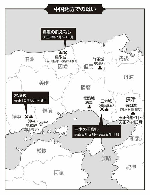 これらの壮絶な戦いを経て、播磨、但馬、因幡の3カ国を羽柴家が支配するという形になったわけですね。もちろん秀吉というのは信長の家臣ではあるんですが、ほとんどその支配に関しては信長から委任されてますので、信長政権下における「大名」という考え方をしていいと思います。羽柴家は織田譜代の大名となったわけです。